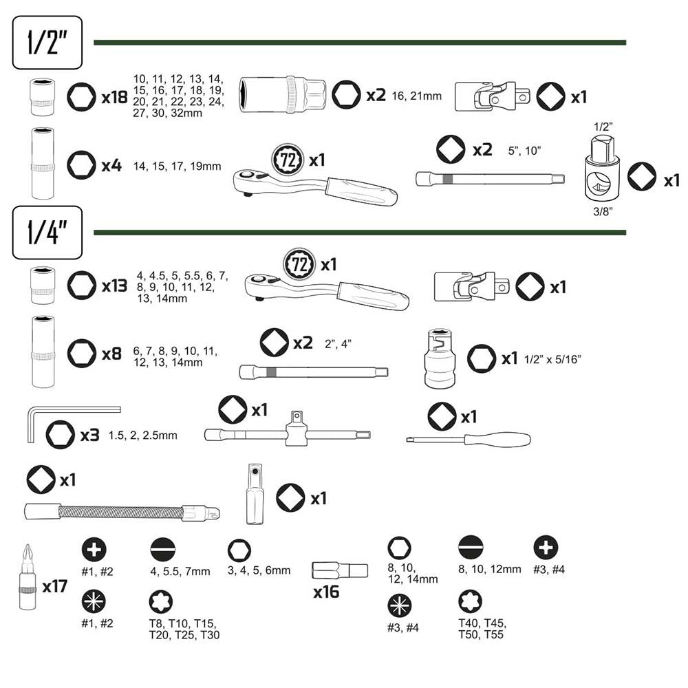 13 METRIC SOCKETS WITH 1/2" CONNECTION: 4-4.5-5-5.5-6-7-8-9-10-11-12-13-14 MM